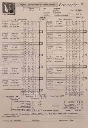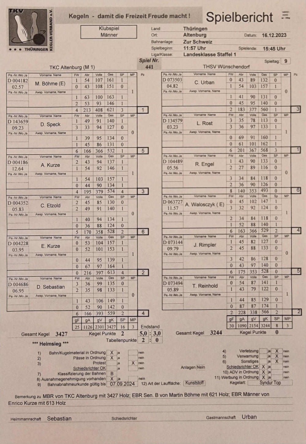 Am letzten Spieltag im Jahr 2023 holte die 1. Männermannschaft einen Grandiosen Sieg gegen die Gäste vom THSV Wünschendorf. Mit insgesamt 3. Bahnrekorden an diesem Tag spielten unserer Männer eines Ihrer besten Ergebnisse. Alles fing mit unseren Ersatzspieler Martin Böhme an, er spielte mit 621 Holz Einzelbahnrekord in der Kategorie „Senioren B“. Geendet hat es mit Enrico Kurze, der mit 613 Holz ebenfalls Einzelbahnrekord in der Kategorie „Männer“ spielte. Auch die anderen Stammspieler aus der Mannschaft spielten ihre Leistungen gut aus. Mit einem Durchschnitt von 571 Holz kam am Ende noch der Mannschaftsbahnrekord dazu. Dieses Ergebnis konnte direkt im Anschluss bei der Weihnachtsfeier gebührend gefeiert werden. Besser hätte die 1. Männermannschaft das Jahr 2023 nicht beenden können.